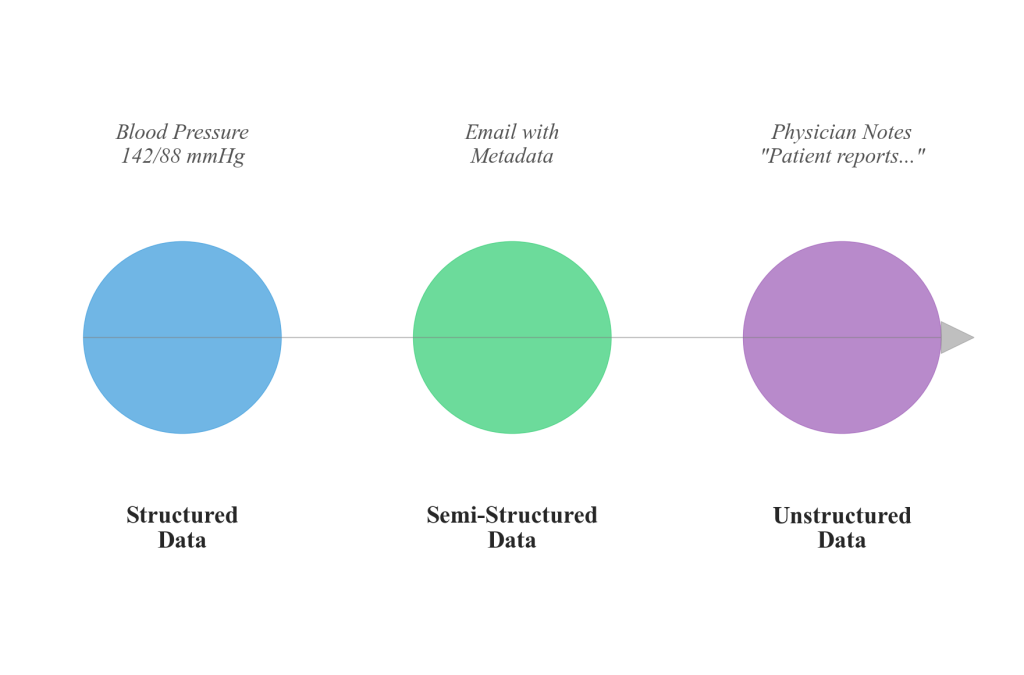 Figure 2.4.1: Healthcare organizations manage data across a complete spectrum from highly structured numerical measurements to completely unstructured narrative assessments. This illustration demonstrates how different data formats contribute distinct analytical value while requiring different processing approaches for meaningful insight extraction.
