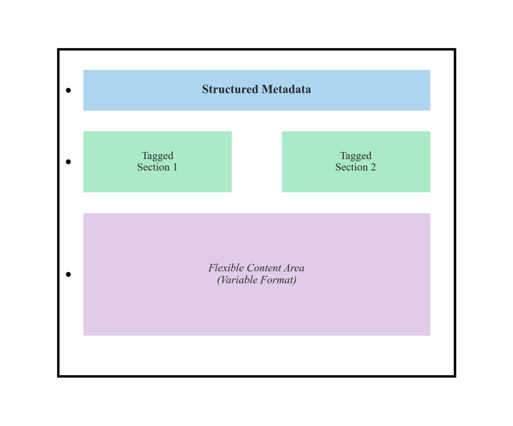 Figure 2.4.2: Semi-structured data combines organizational markers with content flexibility, enabling systematic processing while preserving information richness. This visualization shows how metadata and tagging systems provide structure while allowing diverse content types within the same organizational framework.