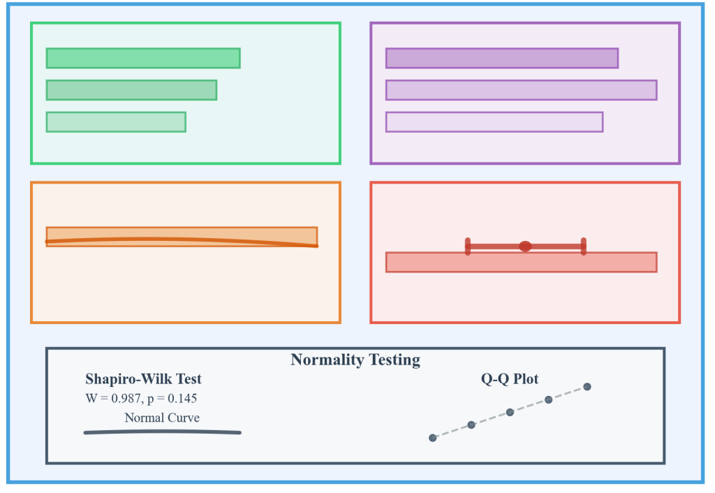 Advanced features include normality assessment through Shapiro-Wilk tests that evaluate whether data follows normal distribution patterns essential for many statistical procedures. These diagnostic tests provide formal statistical evaluation of distributional assumptions with p-values indicating the probability of observing the data pattern if normality assumptions are true. Q-Q (quantile-quantile) plots provide visual assessment of distributional assumptions through systematic comparison of observed quantiles with theoretical normal distribution quantiles.